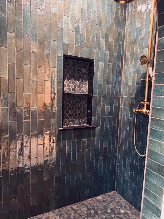 The green tile and gold fixture combo isn’t just about looks—it’s practical too. Green tiles, especially in durable porcelain or ceramic, are low-maintenance and resistant to moisture, making them ideal for bathroom environments. Meanwhile, gold finishes in high-quality materials like brass or stainless steel offer longevity and corrosion resistance, ensuring your remodel stands the test of time.